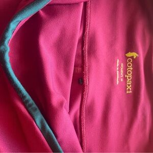 Cotopaxi Raspberry color leggings. Back zip pocket.