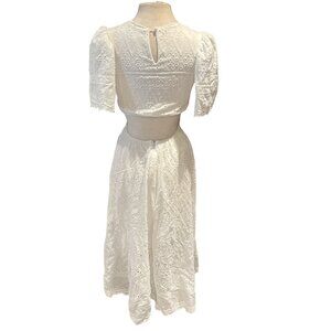 Elegant white eyelet midi dress featuring puff sleeves and a stylish cut-out detail at the waist. Suitable for formal gatherings or summer events.