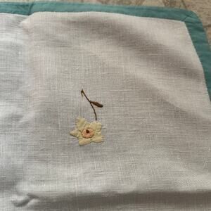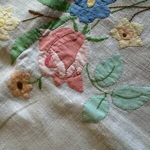 Cottage Core Flower Appliquéd Small Linen White Tablecloth Green Pink Blue 33x35