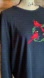 Long sleeve crew neck black top from Cottage Street. Appliqué featuring three red cardinals, embroidered greenery and poinsettias with sequins, and tiny glass bead accents: