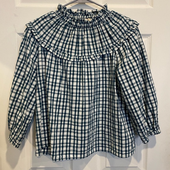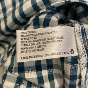 Sleeves are 3/4 length, cuffs and neck are elastic, and color is a very light mint/dark green teal ish. 100% cotton