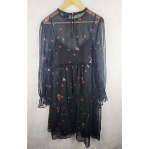 Cottagecore Dress L Midi Sheer Line Long Sleeve Black Floral Asymmetric Layers