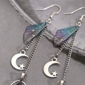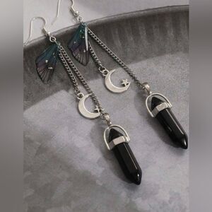 Gothic Cottagecore Dangling Unique Earrings with Black and gray, purple and Blue butterfly wing. Beautiful crescent moon with star and deep black crystal. Feminine touches throughout. Perfect statement piece for any dark wardrobe. 🖤