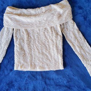A lace knit top featuring a foldover off-the-shoulder neckline, long sleeves, and a semi-cropped hem.