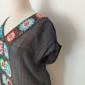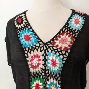Super lightweight and semi sheer gauze like polyester with multi-colored hand knit squares down the front. Side slits and no pockets. This can be worn as a swim suit cover up or as lounge wear around the house. In excellent used condition.