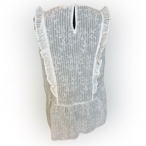 Cottagecore modern white ruffle tank. Delicate and intricate embroidery with ruffle accents gives a poetcore and feminine vibe. Versatile pairings with denim, skirts, shorts.