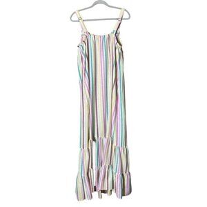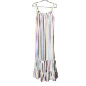 Cottagecore Linen Maxi Dress Large Rainbow Beachy Striped Ruffle Feminine Pastel