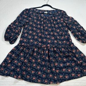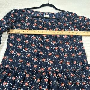 Cottagecore Romantic navy dress with orange, white and green floral design. Ideal for any event. Drop waist with ruffle skirt. EUC.