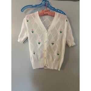 One pink button up cardigan with tulips