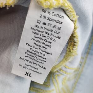 Light wash blue with yellow floral printed yellow stitch embroidery on back and front flap pockets.