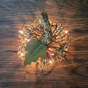 This is a really adorable and pretty light-up/plug-in pumpkin decor for the fall season. Constructed of grapevines and wire and crafted into a pumpkin shape with step, curly vine and metal leaf. Plugs into outlet and comes with addition/extra bulbs. Very good quality and condition. DIMENSIONS: 9" tall x 8" wide.