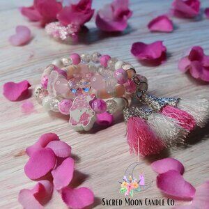 Stretch cord tassled Valentine's/ Galentines day cottagecore beaded bracelet stack comes with three intricately beaded bracelets with gnome focal bead!