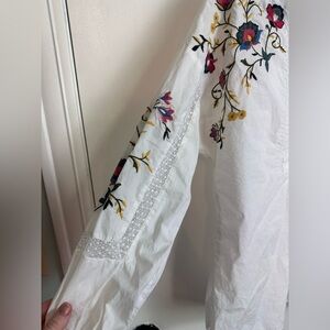 This top has a bohemian (boho) style, characterized by its loose fit, embroidered floral details, and lace-like accents on the sleeves. The lightweight material and button-down neckline give it a relaxed, effortless feel, making it perfect for casual or festival-inspired outfits.