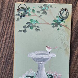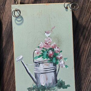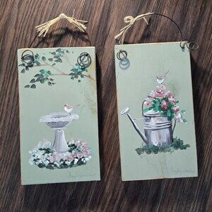 Absolutely precious set of two cottagecore/shabby chic/farmhouse style hand-painted wall hangings. Each painting is of a bird surrounded by flowers...one on a watering can and one in a bird bath. Each are painted on a piece of genuine wood. Wire mounting attached. Hand painted and signed by Mary Kay Crowley of Lake Forest, CA. DIMENSIONS: 12" tall (including wire hanger) x 5.5" wide. 5.5" wide x 10" tall without hanger.