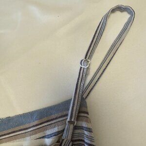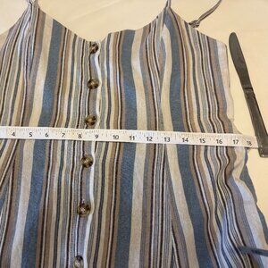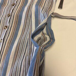 So cute on, this adorable maxi dress buttons up the front and cinches at the waist with a matching fabric belt. Adjustable straps and adorable crisscross strapping at the back give added interest. The vertical stripes are very flattering and it has handy hidden pockets either side. I bought this dress online new and haven't had a chance to wear it as it fits a smaller busted woman than I, so even though it is listed as a large it would be more suited to someone who is smaller on top than on the bottom.