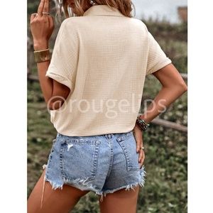 Cotton Beige Short Sleeve Collared Shirt Drawstring Ties Rolled Sleeve Cuff