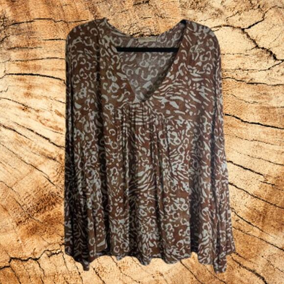 Cotton Bleu XLG long sleeve v neck tan and white rayon woman's casual blouse. Gently used. No rips stains snags.