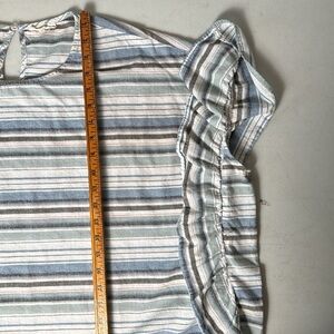 Details: Cotton Bleu poncho style top. Has arm holes, not an actual poncho. Ruffle sides. Stripes. Button at back neck.