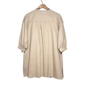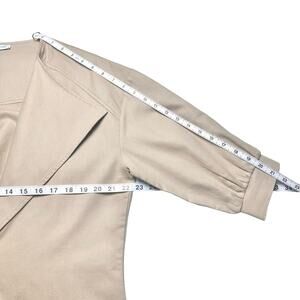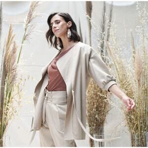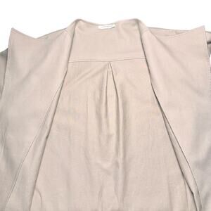 Pre-owned women’s Cotton Brothers cotton linen blend light morning jacket with large lapels, open front with a tie waist, and puff sleeves.