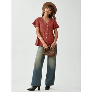 Burnt Orange Short Sleeve Shirt Button Down V-Neck