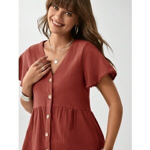Cotton Burnt Orange Short Sleeve Shirt Button Down V-Neck