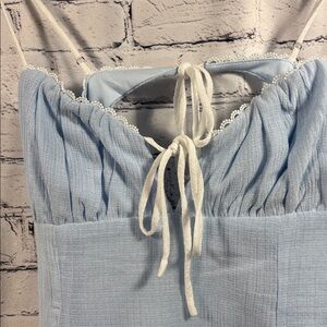 Elegant light blue open back party dress with a textured design. Ideal for stylish occasions. Size Large