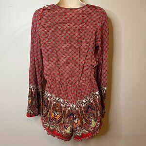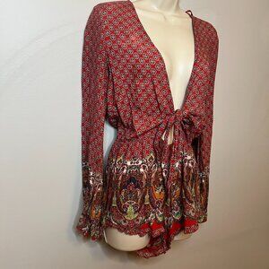 This soft and beautiful paisley-patterned romper was purchased in Joshua Tree, CA and treated with care. Features a flattering low V-neck tie front, bell sleeves, and a fully-lined ruffled bottom hem. Perfect for warm weather and easy to style for casual or dressier occasions.