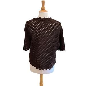 Cotton Chocolate Brown Crochet Open Knit Short Sleeve Open Cardigan, Size 1X