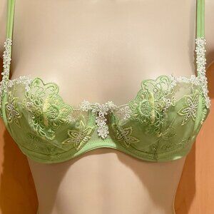Striking and colorful, the Cotton Club demi bra has half cups of whimsical white and yellow floral embroideries on a bright lime green background. A matte jacquard lace is used in the band to emphasize the daring burst of colors in the cups. Note the cute daisy chain on the double straps for added elegance.