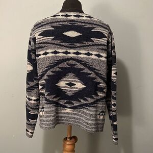 This sweater effortlessly combines comfort with contemporary style, featuring a chic abstract knit pattern that adds a touch of modern flair to your wardrobe. The full-zip front and collared neckline offer versatility in styling, allowing you to layer up for warmth or showcase your favorite accessories. In a size Medium, it provides a flattering fit that complements various body shapes. The contrasting gray and blue hues create a sophisticated and versatile palette, perfect for both casual outings and more refined occasions.