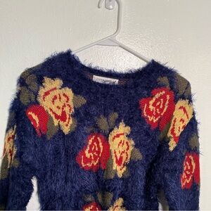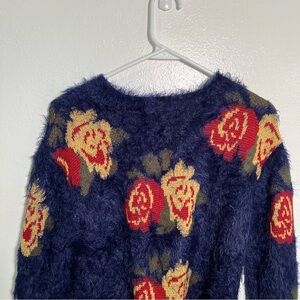 Great condition. Cotton Emporium. Fuzzy crewneck sweater. Dark blue color with yellow and red rose floral pattern. Size small. 60% nylon, 40% acrylic. Pit to pit laying flat 17” Shoulder to hem 23” Sleeve (shoulder seam to hem) 18”. All measurements are approximate and taken lying flat. Smoke free home. No trades, offers welcome.