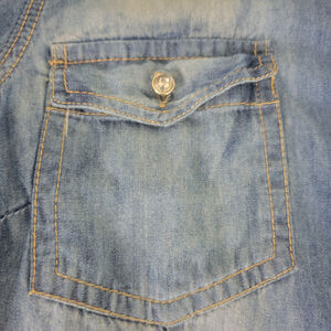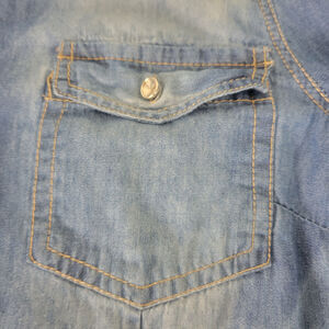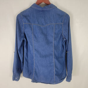 Cotton Express Shirt Womens Large Petite Blue Top Chambray Roll Tab Button Up