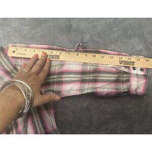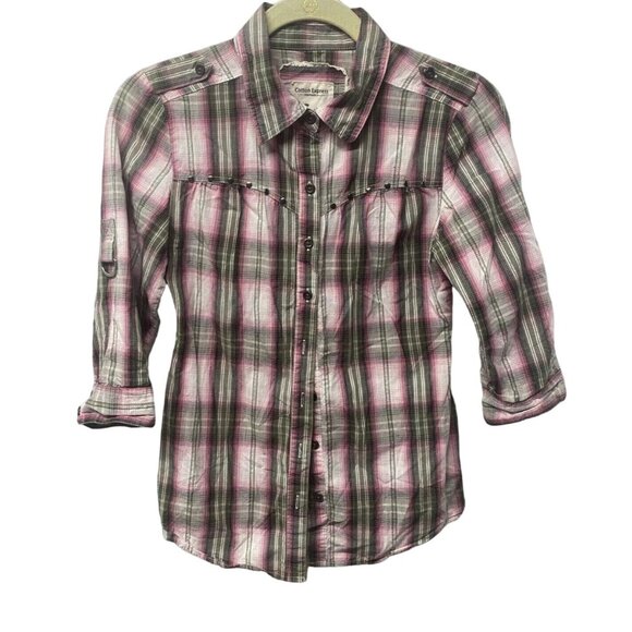 Cotton Express Womens Button Up Pink Gray Plaid Cotton Sz XS 3/4 Sleeves Western
