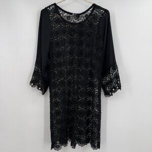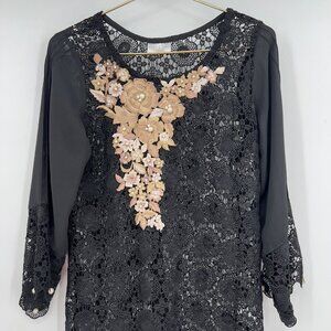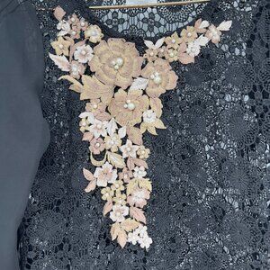 "Stunning black lace shift dress with sheer 3/4 sleeves, floral applique, and pearl accents. Perfect for weddings, cocktail parties, or any special event. Elegant, feminine, and timeless style."Size M The Body Lining Is Missing