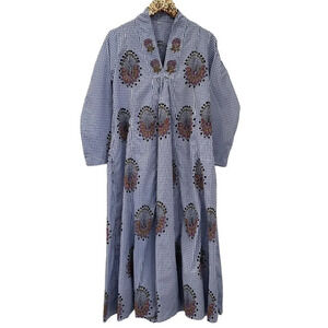 Beautiful cotton poplin dress with long sleeves, v-neck, pleated detail in the front.