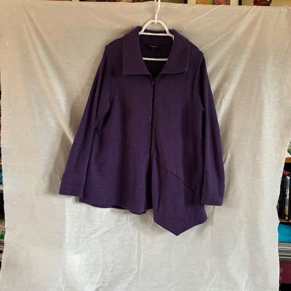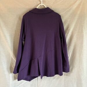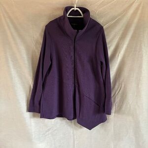 Made in America asymmetrical hem cotton knit jacket. FH Clothing is a boutique brand known for great fabrics and stylish clothes. The fabric weight is like a sweatshirt and can be washed in cold water. The funnel neck can be zipped down or up for some cozy warmth. It has an a-line shape with a back vent.