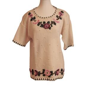 Cotton Knit Short Sleeve Scoop Neck Top Ribbon & Pearl Floral Embroidered sz M
