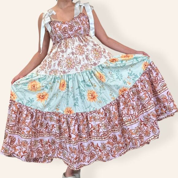 characterized by its tiered design and multiple floral patterns. The dress features an empire waist, a smocked bodice, and wide satin ribbon shoulder ties. The skirt is composed of three tiers, each with a different floral print in shades of lilac, rust, light blue, and peachy orange.