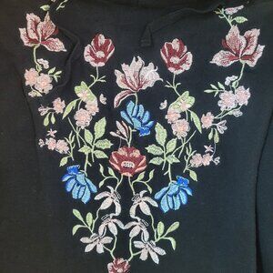 Features stunning floral embroidery in pink, blue, and green tones across the chest