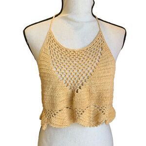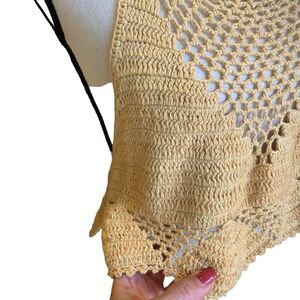 Cotton On Boho Crochet Open Weave Knit Tied Halter Crop Top Tan Scalloped Hem Medium Like New
