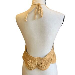 Cotton On Boho Crochet Open Weave Knit Tied Halter Crop Top Tan Scalloped Hem Md