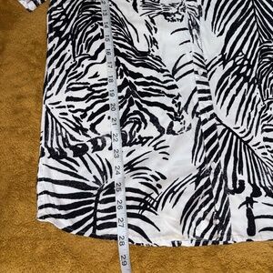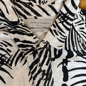 Stand out this summer with this lightweight, tropical-style short sleeve shirt from Cotton On Garments. Features a bold black-and-white jungle print with tigers and palm leaves. Soft, breathable fabric makes it perfect for warm weather.