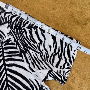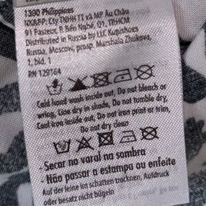 • Condition: Gently used. Two faint yellowish stains (approx. 1 inch) on the lower back area—see photos for close-up. Not very noticeable when worn due to the busy print.