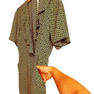 Stylish romper with ruffle details and short sleeves and front pockets by Cotton-on. Features a geometric pattern. Back elastic for additional stretch. 100% Poly. Size Medium
