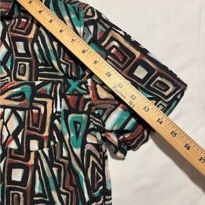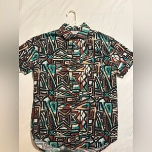 Vibrant shirt with a dynamic multicolor design. Features a mix of black, green, and brown tones.