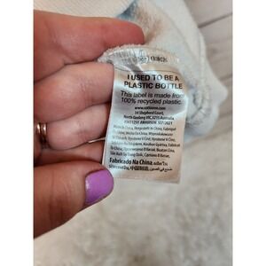 Eco-conscious apparel, tag proudly stating "I USED TO BE A PLASTIC BOTTLE"