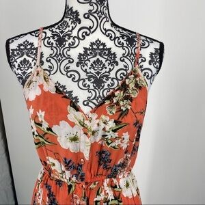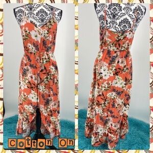 Cotton On. Floral dress with shades of orange, white, peach, navy, light blue, cream and green. Buttons up the front. Buttons match pattern of dress. Adjustable spaghetti straps. Fitted waist. Ruffle skirt. Semi hi-low style. 100% viscose. Size medium.