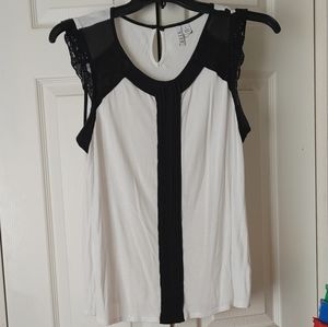 White cotton tank top that has black lace shoulders and a thin black ruffle like design down the front.