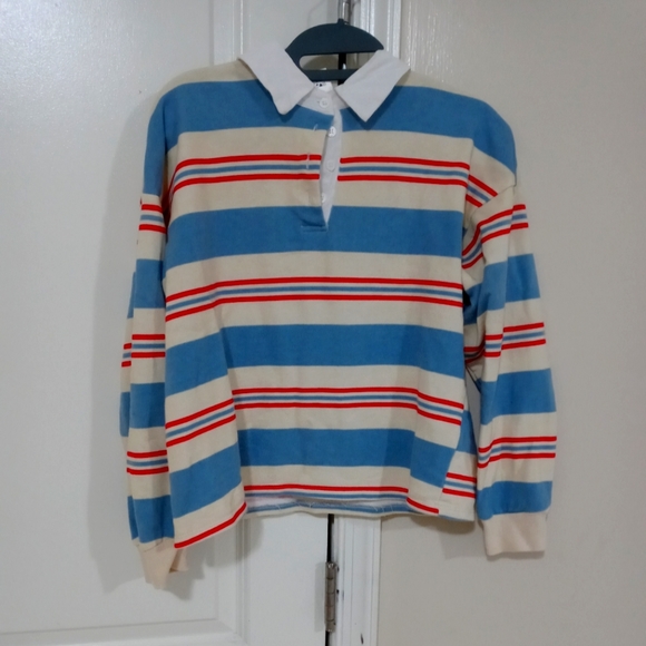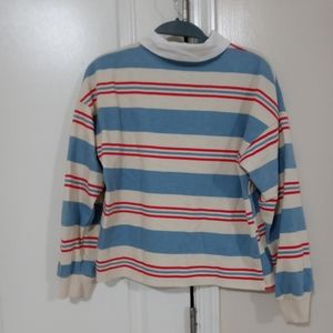 cute tan Rugby shirt with red and blue stripes. size small. in great condition