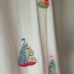 Crisp cotton with fun vibrant primary colors against white background; flows freely and slit for easy walking and summer strolls